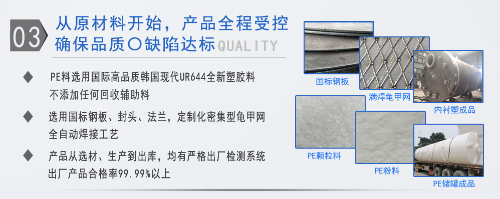 公司有鋼襯塑PE/PO、PE全塑、碳鋼、不銹鋼四大系列100多個品種,專注于常壓儲存容器生產,其產品包括鋼襯塑儲罐管口一體成型PE儲罐、碳鋼儲罐、不銹鋼儲罐、反應釜、攪拌罐、離子交換柱、鋼襯PE/PO儲罐塑料儲罐、鹽酸儲罐、硫酸儲罐等等。更大限度滿足廣大客戶的各種需求,同時可以根據客戶的需要加工定制各種防腐設備。